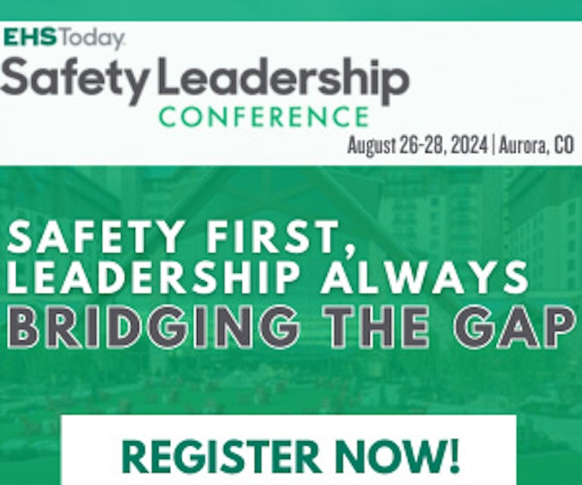 | | Sponsored | | We invite you to join safety leaders at EHS Today’s Safety Leadership Conference where you’ll benefit from candid, knowledgeable insights and networking opportunities focused on safety excellence. Don’t wait to secure your spot at the event that your peers are talking about! |