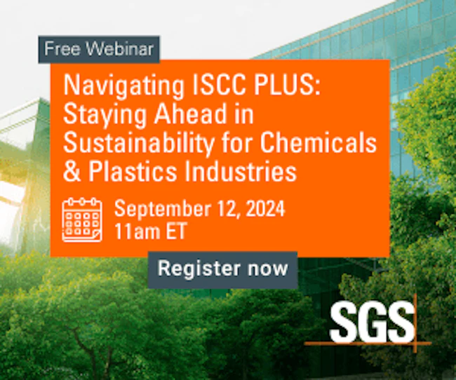 | | Sponsored | | Stay ahead of the curve and align with eco-friendly practices. Join our webinar on September 12, 11AM ET to learn how International Sustainability and Carbon Certification (ISCC) PLUS certification supports sustainability in the chemicals and plastics industry. We’ll cover updates, benefits, and the certification process, helping you enhance traceability, regulatory compliance, and consumer trust. |